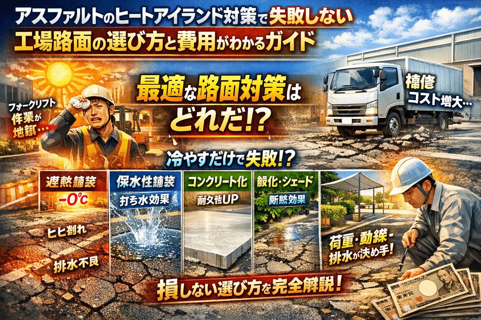 真夏のヤードが灼けてフォークリフトのオペレーターから苦情が出始めているのに、「遮熱性舗装がいいらしい」「保水性舗装でヒートアイランド対策」といった一般論だけで判断すると、数年後に再補修と稟議やり直しが待っています。多くの解説ではアスファルトが熱をため込み、遮熱や保水が有効という結論で止まりますが、工場や倉庫の敷地では通行荷重と動線、排水勾配、既存劣化を無視した工法選定そのものが最大のリスクになります。